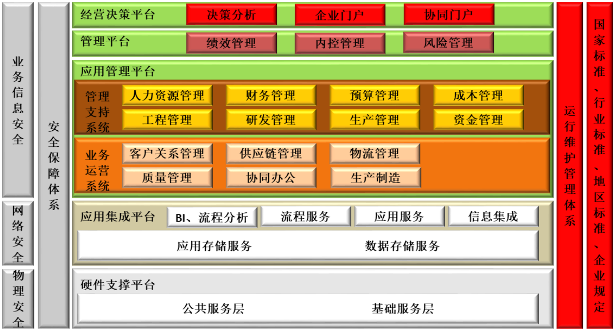 湖南金葉眾望科技股份有限公司信息化總體架構可以概括為“一個標準,兩套體系,三大平臺,三個層次15大應用”。