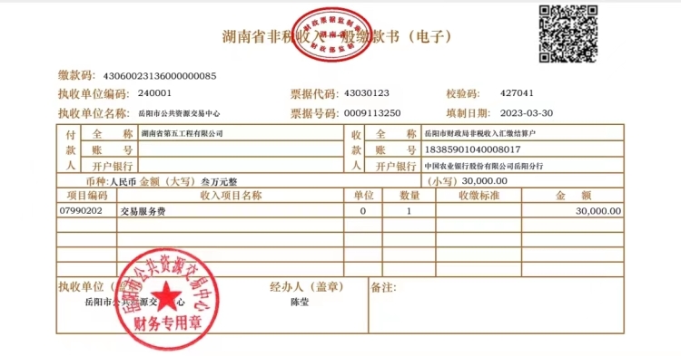 2023年3月30日17:30分,繳款人通過掃描岳陽市公共資源交易中心服務(wù)費(fèi)線上繳費(fèi)平臺(tái)生成的二維碼進(jìn)入“湖南非稅公眾服務(wù)平臺(tái)”繳納了“湘陰縣監(jiān)管中心一期建設(shè)項(xiàng)目”交易服務(wù)費(fèi),并收到了平臺(tái)推送的電子非稅收入一般繳款書。...